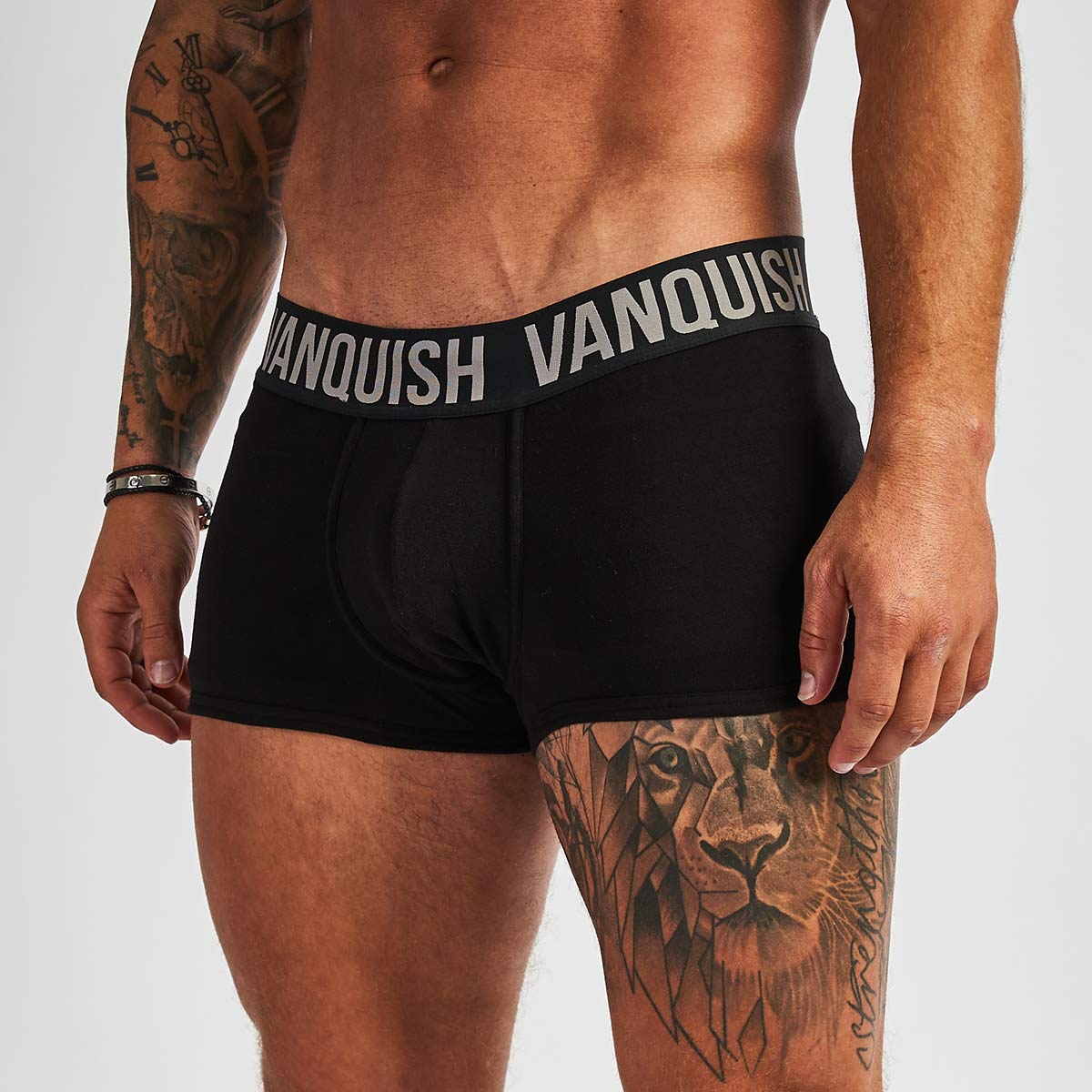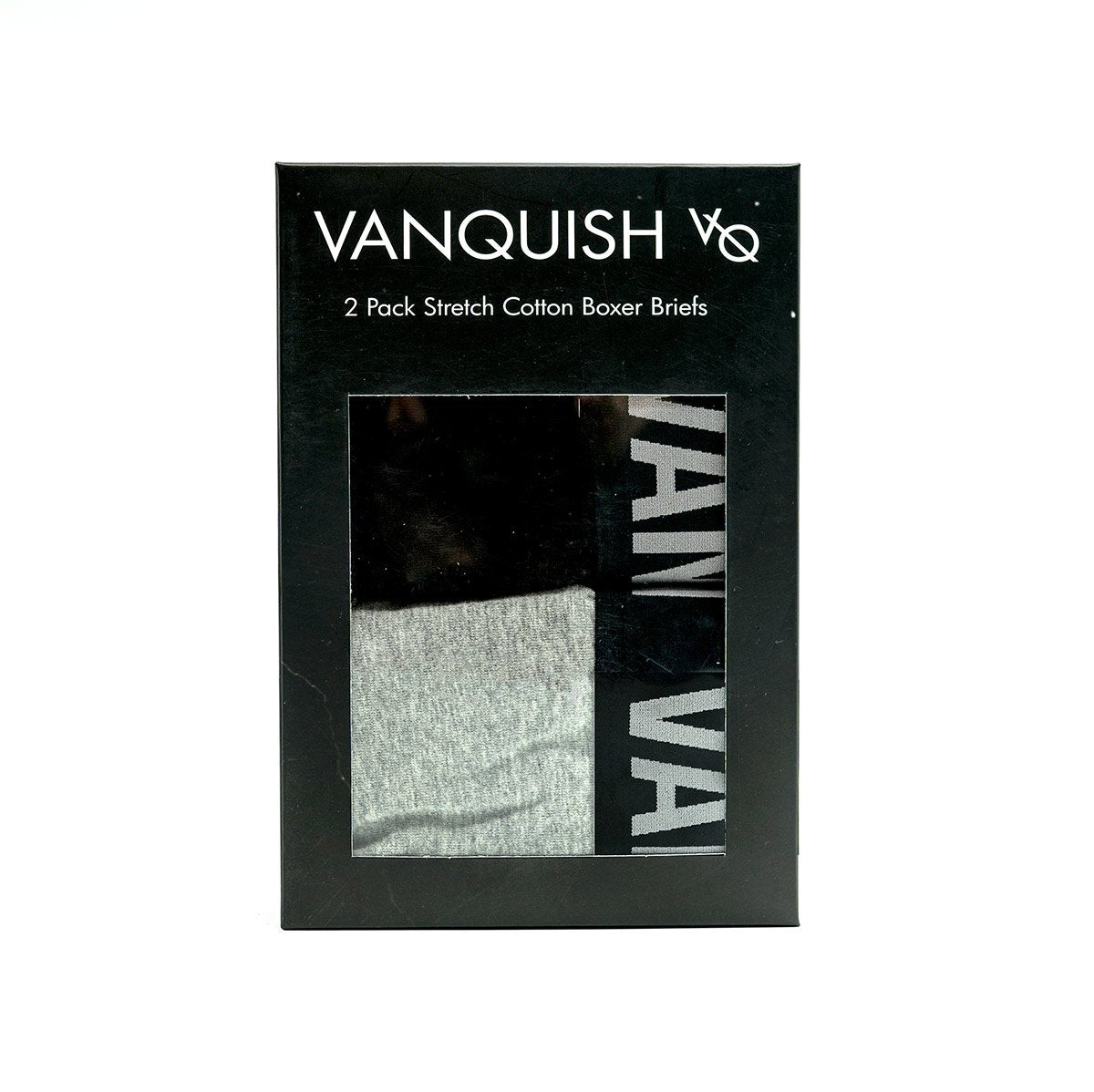 Design: A bold Vanquish branded custom woven super soft waistband sits atop a staple boxer brief silhouette. Featuring two essential colours: Black and Grey.